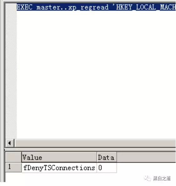 EXEC master..xp_regread 'HKEY_LOCAL_MACHINE','SYSTEM\CurrentControlSet\Control\Terminal Server','fDenyTSConnections'