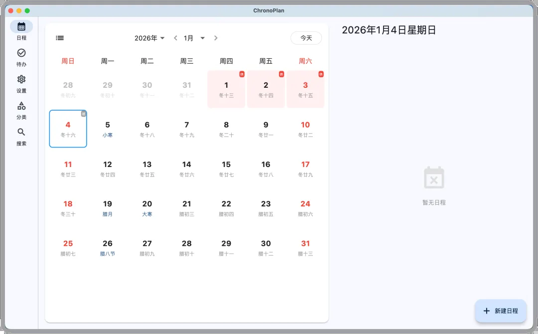 今天给大家分享一款2026年都应该安装的一款软件,这款软件叫面「ChronoPlan」它是一款超好用的个人日历日程待办事项软件,提供日历视图、日程/待办管理与分类体系。这些都可以自定义。
