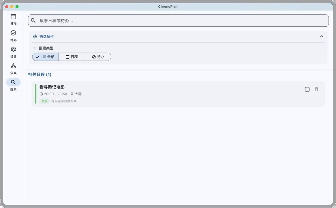 不仅仅拥有农历展示、数据导入导出与全局搜索。而且提供了 Windows 和 macOS 客户端。随时可以在搜索框搜索你设置的日程和待办事项。